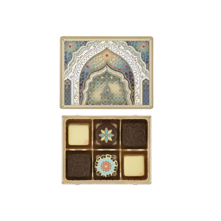 • アズラクジャミールは美しい青という意味。タイルをイメージしたチョコレートは3種類の味わい。煌びやかな缶が異国への旅へと誘います。