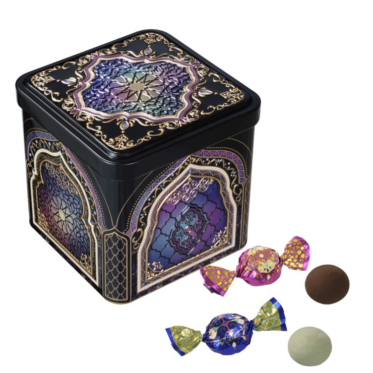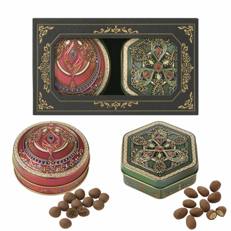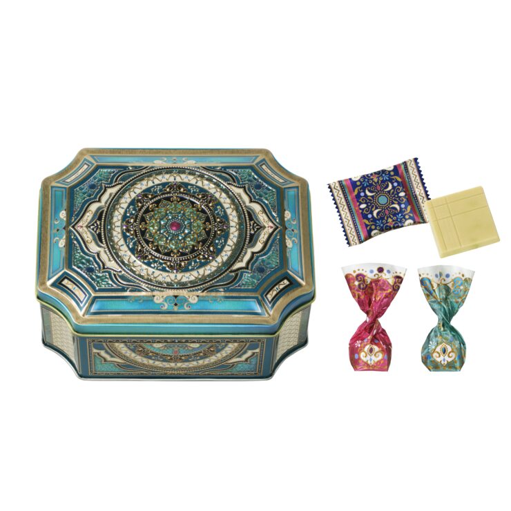 チョコレートを、キラキラの包み紙に包んでオリエンタルなデザインの缶に集めました。宝石箱を開けるようなわくわく感をお楽しみください。