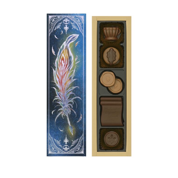 - 虹色の羽ペンが描かれた箱に、コーヒーや紅茶のチョコレートを詰め合わせました。