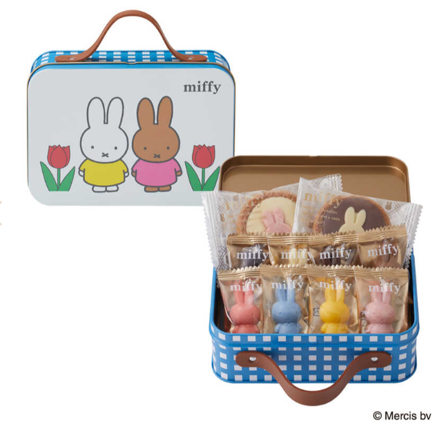 - 取っ手付きの缶に、ミッフィーのチョコレートタルトやミッフィー型チョコレートを楽しくアソート