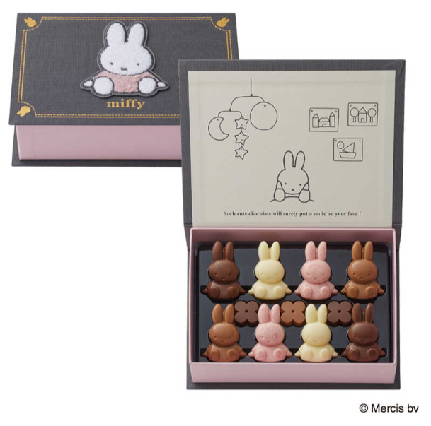 - ミッフィーと一緒に、ひと休み。ちょこんとお座りした、愛らしいミッフィーのかたちのチョコレートをふわふわワッペンが付いた、布貼りボックスにずらりとアソート