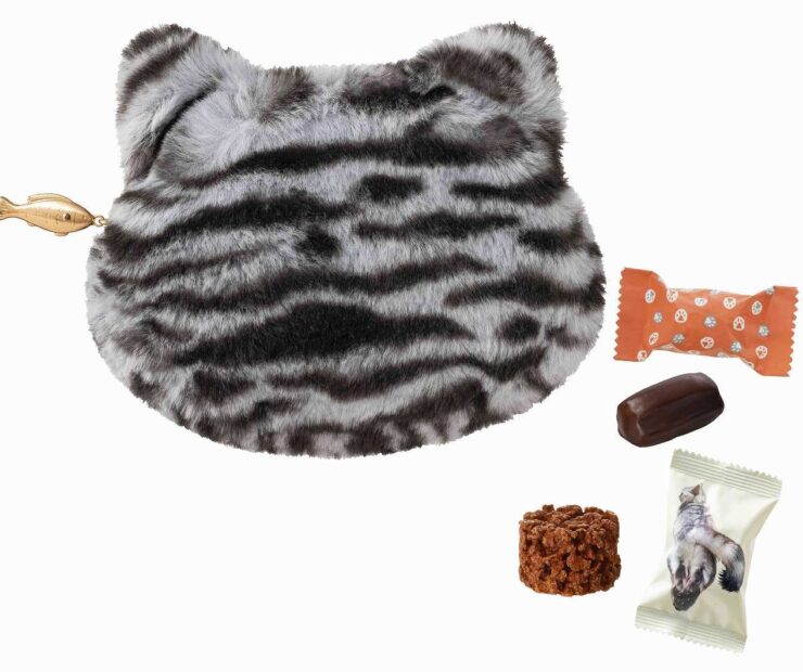 サバトラ猫をイメージしたポーチに2種類のチョコレート菓子を詰め合わせたにゃ。