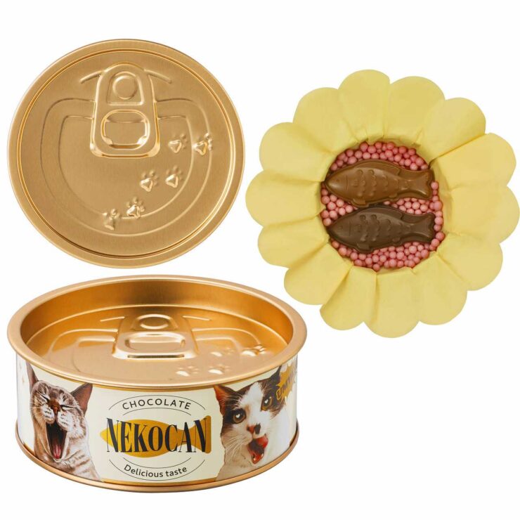 - 遊び心満載の猫缶をモチーフにした缶に、魚型のチョコレートが入ってるにゃ!