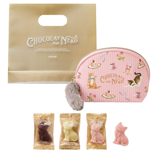 - “ショコラな猫”が描かれた限定デザインにしっぽのふわふわとした肌触り。猫好きさんたちは癒されること間違いなし。可愛いポーチの中には、3種類のプレーンチョコレートが入り