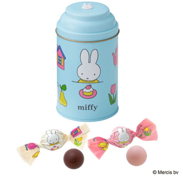 - ケーキを楽しむミッフィーがデザインされたお洒落なティーポット缶に、ストロベリークリーム、ティーキャラメル2つの味わいのオリジナル個包装のトリュフショコラをアソート