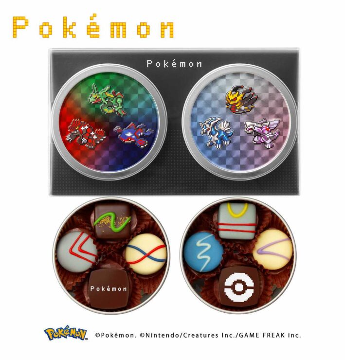 - 今年の伝説のポケモン缶セットにはホウエン地方のカイオーガ、グラードン、レックウザと、シンオウ地方のディアルガ、パルキア、ギラティナが登場。それぞれのポケモンをイメージしたチョコレートを詰め合わせました。