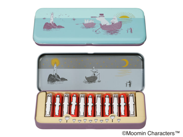 - 缶ケースの蓋には日の出とともに船を進めるムーミンパパとニョロニョロたち。蓋裏には月の光と灯台が明るく照らす夜に釣りをするスナフキンの姿を描き、りんごとチョコレートクリームの味わいを揃えました。