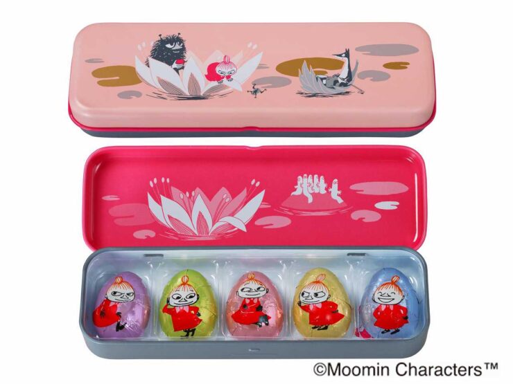 - お花や草に乗って水面を散策するリトルミイたちを描いた缶に、いろいろな表情がかわいいリトルミイの包装紙で包んだパフインチョコレートを入れました。