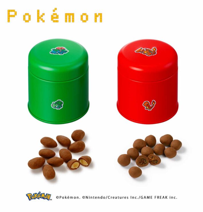 - フシギソウ、フシギバナ、ほのおタイプのポケモン、ヒトカゲとその進化形リザード、リザードンを円柱缶にデザインし、アーモンドチョコレートといちじくチョコレートを詰めました。