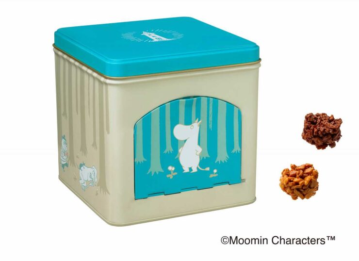 - ムーミンたちが森の中でのんびりとした時間を過ごしている様子を描いた缶に、ニョロニョロやムーミンなどのチョコレートを詰め合わせました。