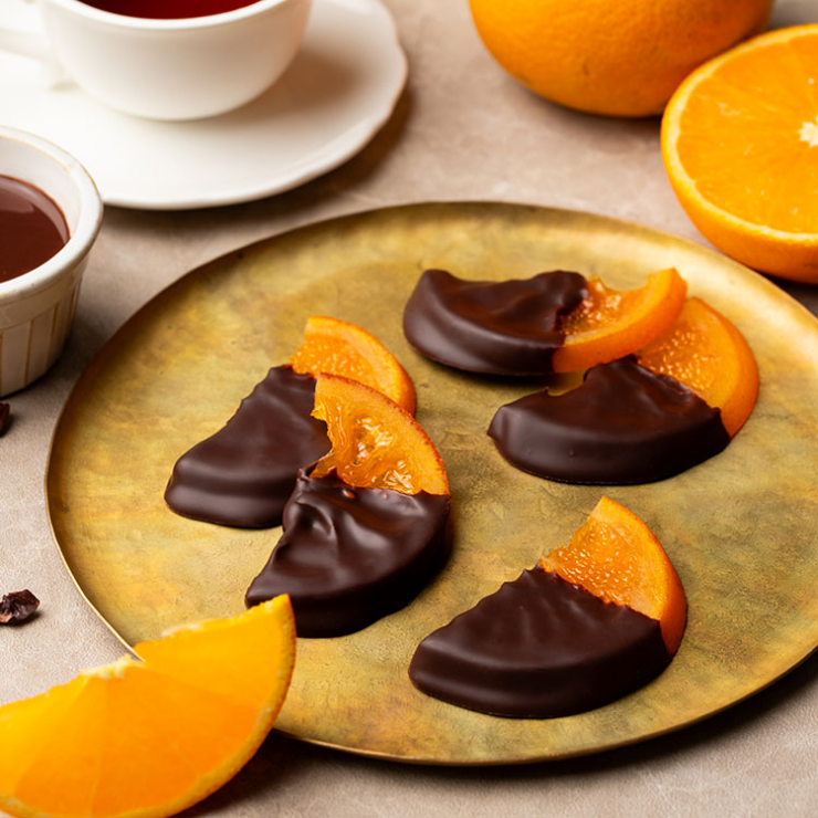 - 太陽をたっぷり浴びて育ったみずみずしいバレンシアオレンジを、ダークチョコレート、ミルクチョコレート、ホワイトチョコレートでコーティングしました
