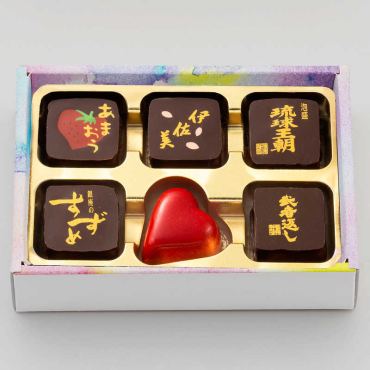 - 九州生まれの厳選された焼酎・泡盛をやさしくゼリーに閉じ込め、さらにやわらかいチョコで包みました